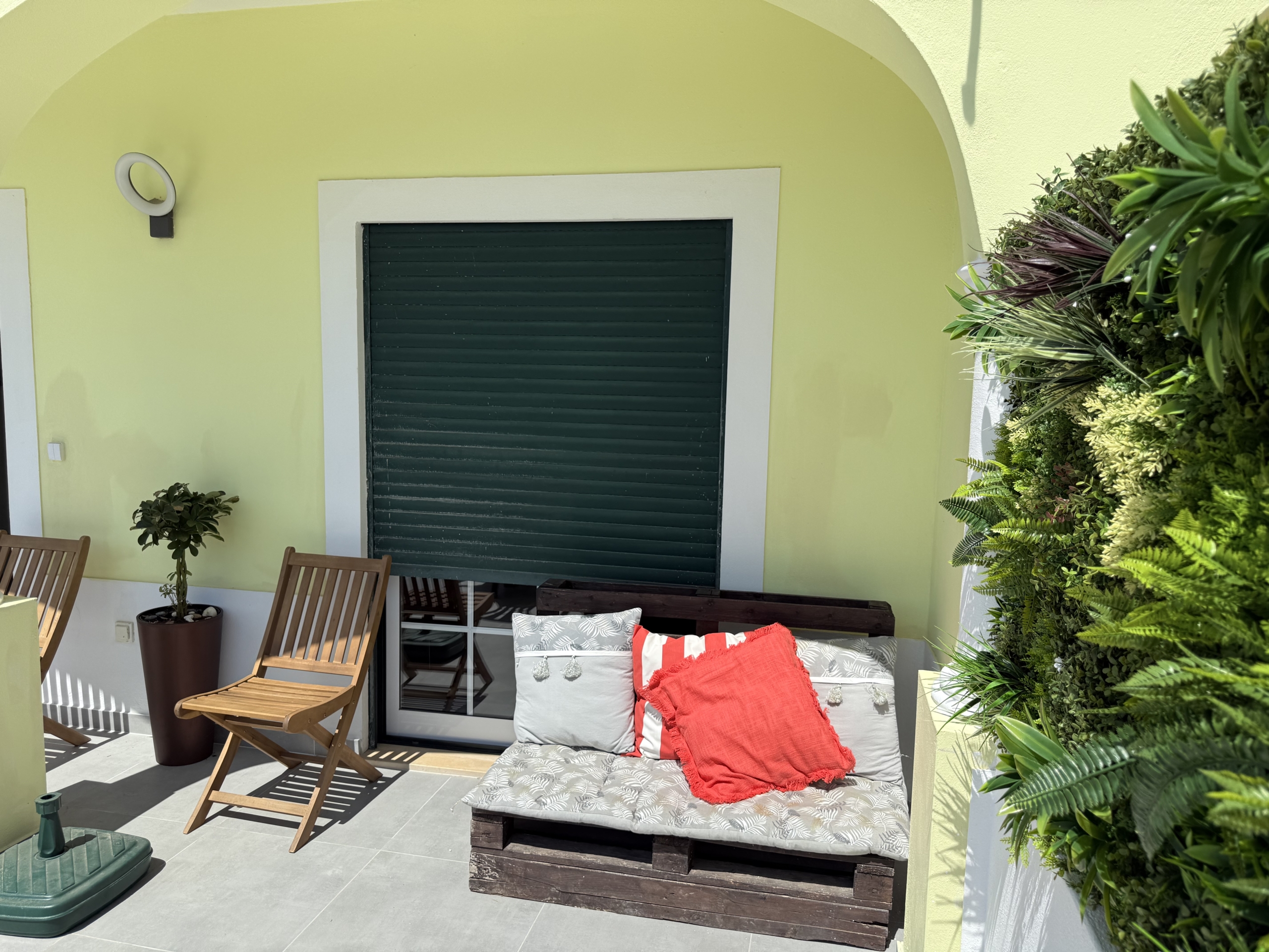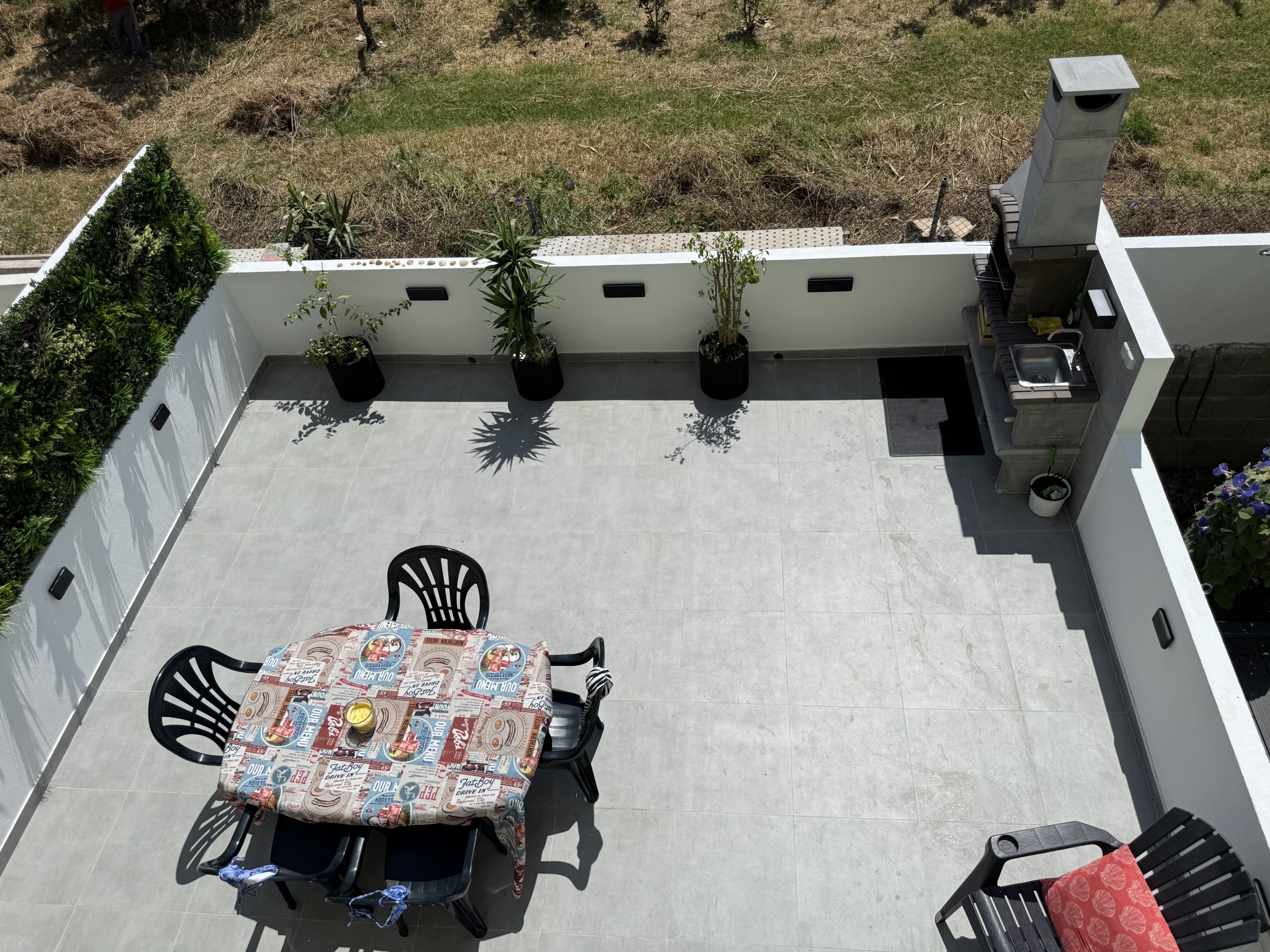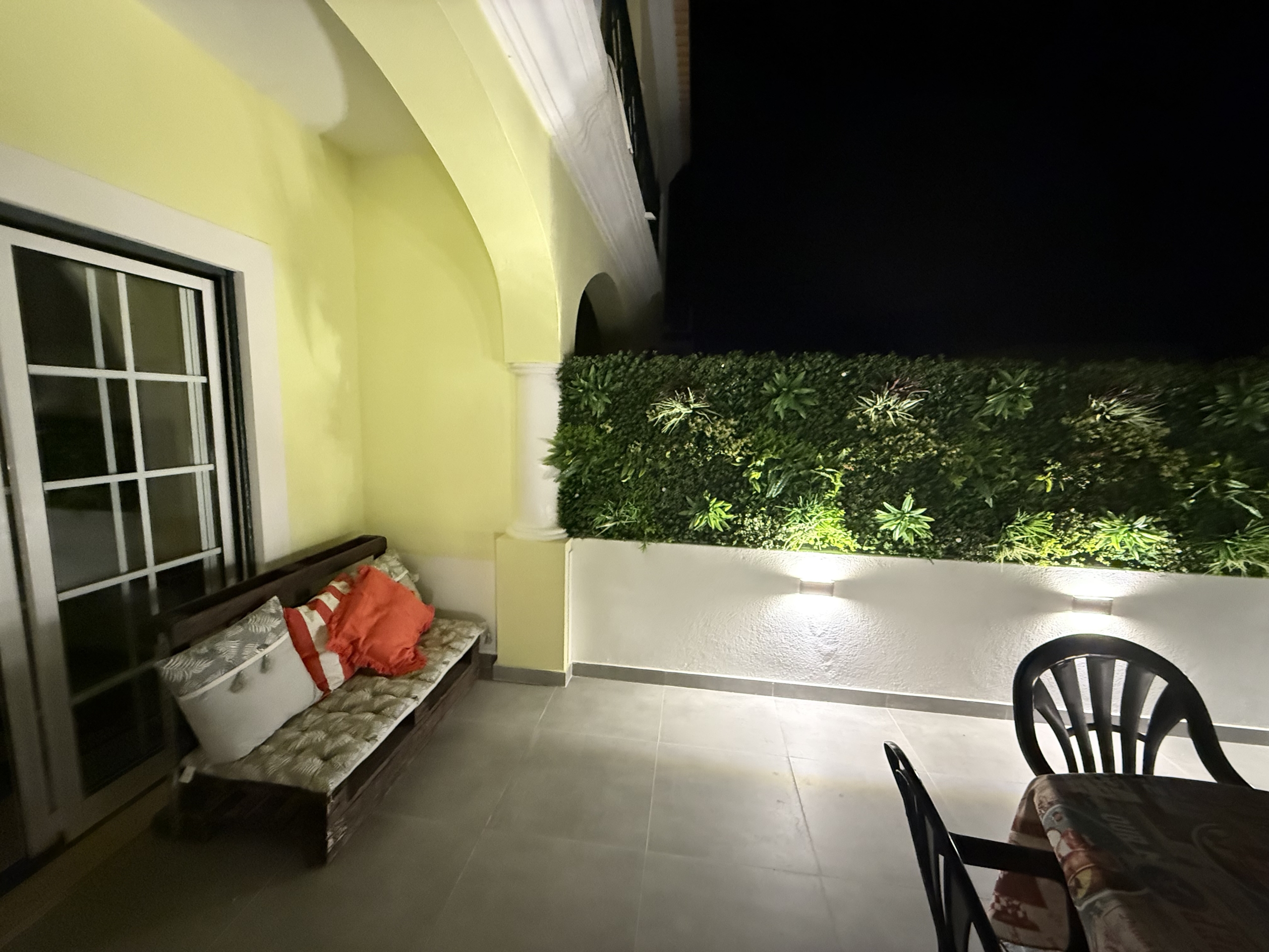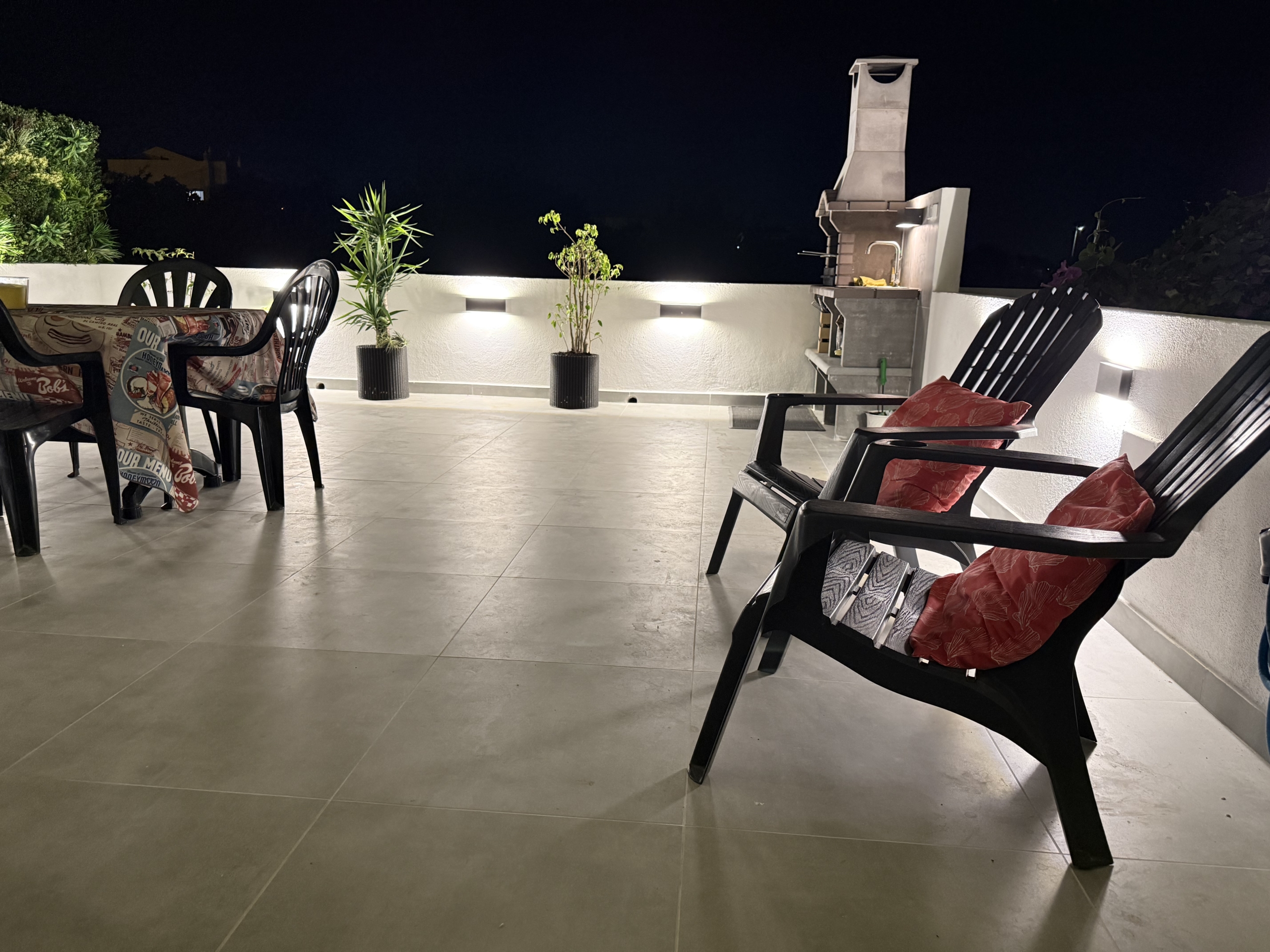 This comfortable and spacious accommodation is spread over two floors, with an approximate area of 150 square meters. Next to the entrance we find the communal pool of the condominium and a small garden. On the ground floor is the fully equipped kitchen, the service bathroom and the living room. From the living room we have access to the balcony and a small outdoor area with grass and fruit trees. Upstairs are the bedrooms and a complete bathroom. One of the bedrooms is ensuite and has a private bathroom. Two of the bedrooms have king size beds and one bedroom has three single beds.